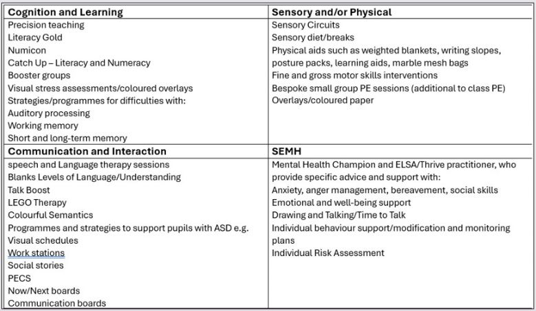 In addition, pupils may be provided with specialised equipment or resources such as ICT (e.g. SEND specific software, laptops) and/or additional adult help. All actions taken by the class teacher will be recorded and shared with parents.