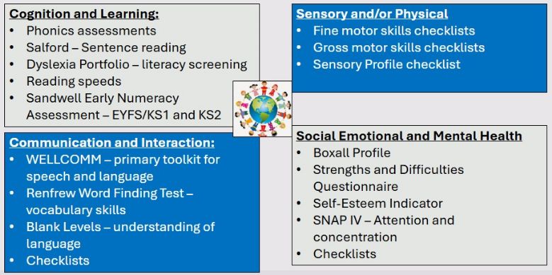 The following assessments are used across our school to identify SEND needs.